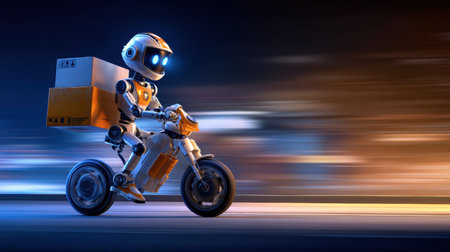 A robot is riding a motorized delivery bike while carrying packages on its back at night on a street.