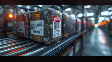 Close-up of labels and barcodes on an air container, highlighting the shipping details and tracking information