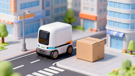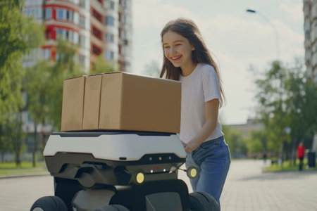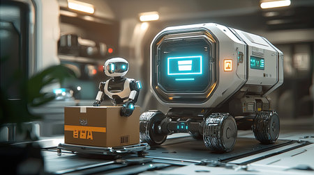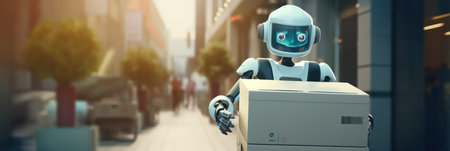 An innovative robot delivery system transports packages to customers efficiently on an urban street. This advanced technology showcases modern logistics and convenience.