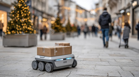 A delivery robot moves through a lively pedestrian shopping street adorned with festive decorations. It's the holiday season, and people browse the storefronts while enjoying the atmosphere.