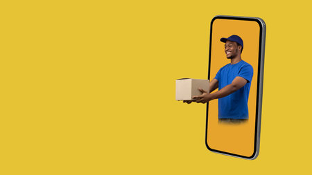 Black Deliveryman In Phone Giving Box To Side, Yellow Background