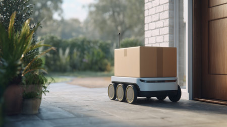 This image showcases a compact delivery robot designed for modern logistics, standing outside a stylish home. The innovative robot highlights convenience and efficiency in urban environments.