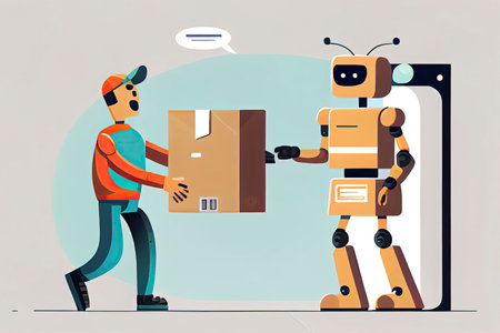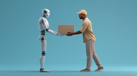 Delivery courier. Robot give the cardboard box to the person. Delivery future.Generative AI