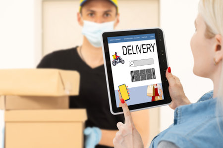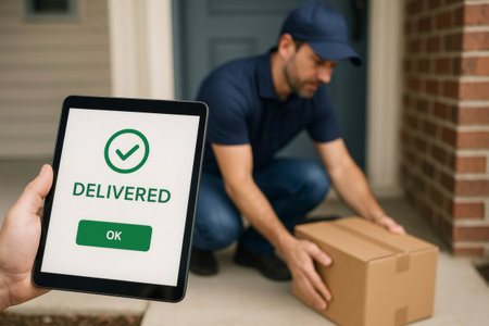 Courier placing package on doorstep and customer confirming delivery on tablet with a checkmark and delivered message