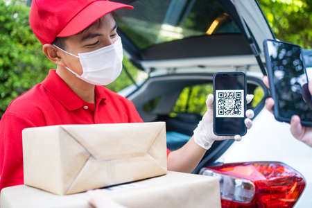 Asian delivery man deliver box to customer girl from car trunk at home. Beautiful woman wear mask, make quick and easy contactless payment by use smartphone Scanning QR code to pay for postman service