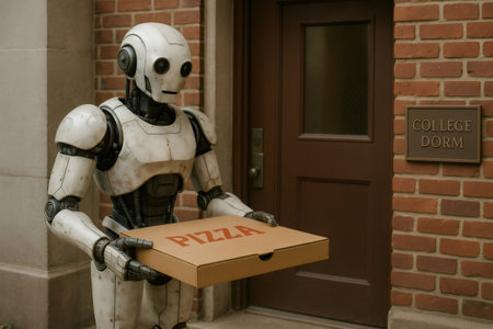 Robot delivering a package in autumn. AI in everyday tasks.