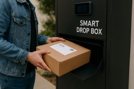 Brightly lit features environment a customer happily retrieving a package from a box locker, showcasing efficient delivery service in a modern setting.