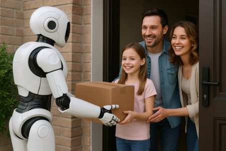 Humanoid autonomous delivery robot bringing cardboard box to smiling family at their house entrance