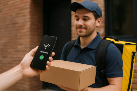 Courier holding cardboard box receiving contactless payment via smartphone from customer using NFC technology
