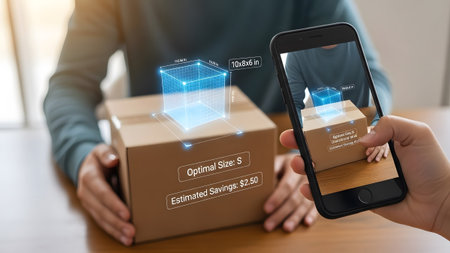 A smartphone displays an AR overlay measuring a cardboard box, showing optimal size and...
