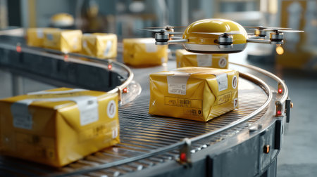 A yellow drone hovers above packages on a conveyor belt in a modern warehouse, symbolizing innovation in parcel delivery and automation processes.