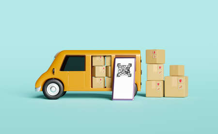 Female delivery worker deliver parcel box,happy child girl receive ordered goods from online shopping,payment purchase on mobile phone scan QR code pay from home,lifestyle,contactless cashless society