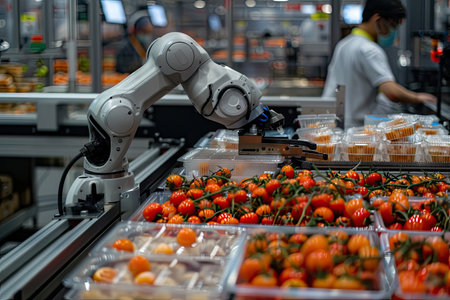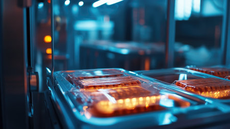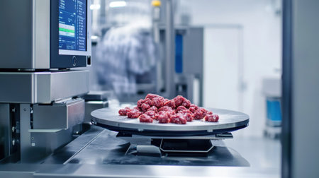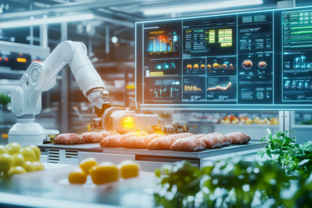 Inside a modern food production facility, robotic arms efficiently assemble plant-based meat products.