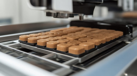 This image showcases a sophisticated automated system in a confectionery factory, highlighting the precision in producing high-quality sweets on trays.