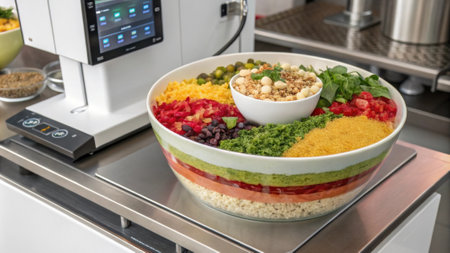 An advanced culinary machine assembles a colorful bowl blending grains seasonal vegetables and a rich dressing with artistic flair in each layer..