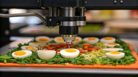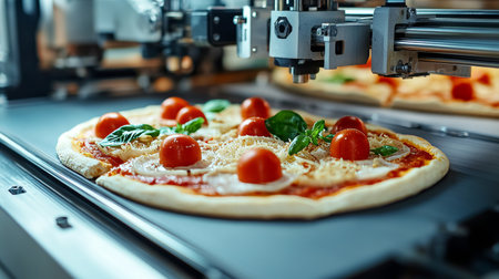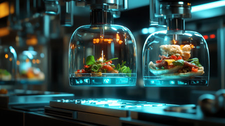 Innovative food technology with futuristic devices preparing meals, symbolizing the evolution of modern cuisine.
