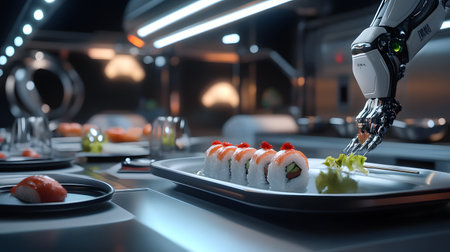 A robotic arm skillfully prepares sushi in a modern kitchen, showcasing the fusion of technology and culinary art.
