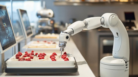 A sophisticated robotic arm skillfully prepares a dessert topped with fresh raspberries in a modern kitchen, showcasing cutting-edge technology and automation in culinary arts.