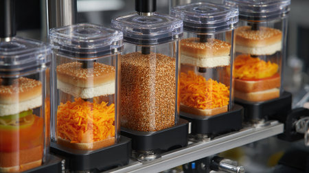 AI burger production line showcasing new taste technology, futuristic food processing.