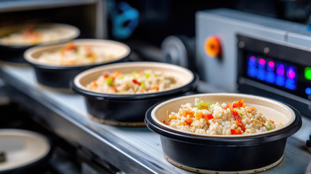 Preportioned trays of stir-fried meals on automated conveyor moving toward sealing unit