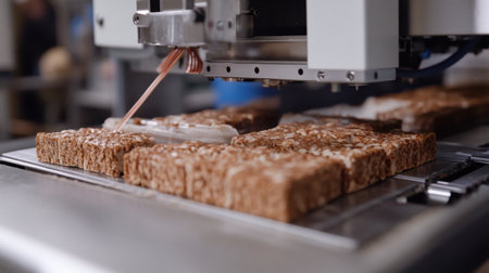 Experience the cutting-edge technology in food production with this automated process of crafting delicious cereal bars, showcasing precision and quality in a factory setting.