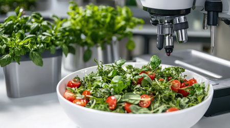 Advanced robots meticulously assemble vibrant salads with fresh ingredients in a state-of-the-art kitchen.