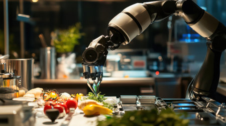 A captivating view of a futuristic kitchen showcasing a robotic arm engaged in meal preparation. Brightly lit with fresh vegetables and an organized workspace, this image represents the integration of technology in culinary arts.