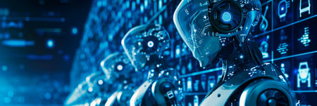 background with an army of advanced robots, technologies, representing artificial intelligence, programming and robotics. Generative AI