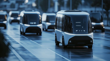 A fleet of autonomous electric vehicles navigates a modern city road at dusk. The scene highlights future technology in urban transportation and sustainable mobility.