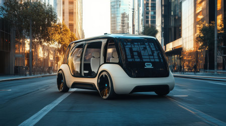 Urban mobility and autonomous taxi transport vehicle riding on city street. Post-produced generative AI illustration.