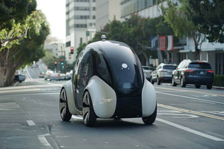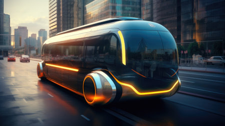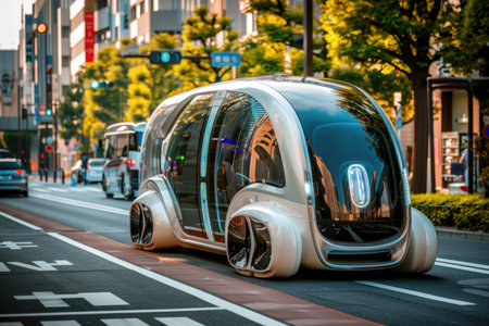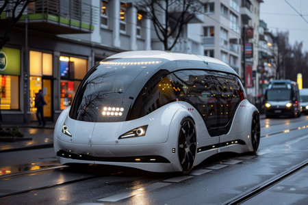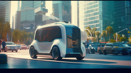 A cutting-edge vehicle with a modern design is smoothly cruising through busy city streets, embodying a vision of futuristic transportation.