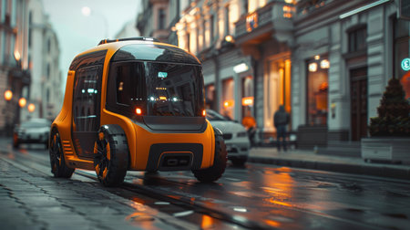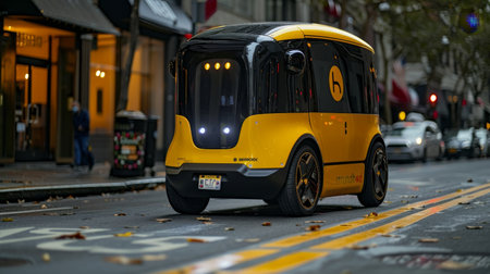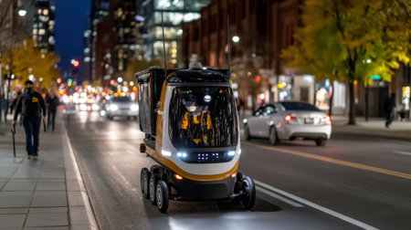 An Innovative Autonomous Delivery Vehicle Skillfully Navigating the Busy Urban Streets on a Crisp Autumn Evening, Powered by Generative AI Technology