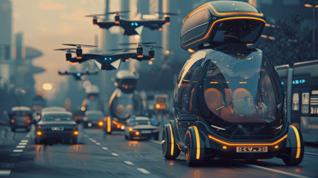 An image illustrating an advanced autonomous transportation network, with self-driving vehicles, drones, and personal flying devices moving in harmony, showcasing a future of efficient and safe transportation.