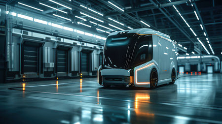 Futuristic delivery van in a hightech facility, sleek design, dynamic lighting, motion blur, side view