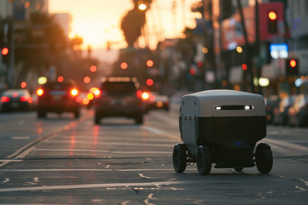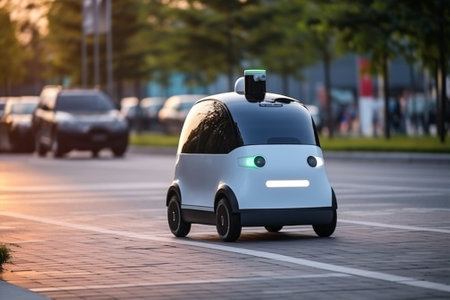 Autonomous Delivery Vehicle Operated by Robotic Technology on City Streets at Dusk Enhancing Last Mile Logistics Generative AI