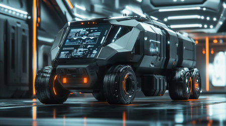 3D rendering of a monster truck in a futuristic space station.