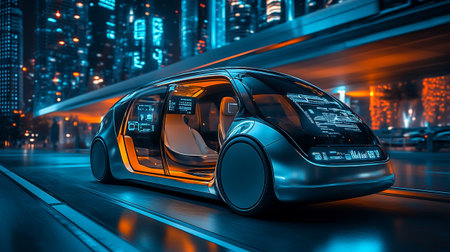 A sleek autonomous futuristic vehicle navigates a vibrant neon-lit cityscape at night