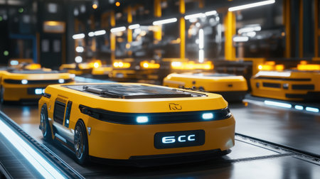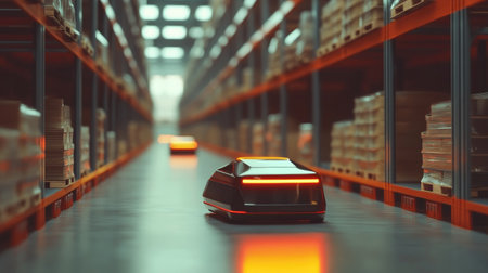 Modern warehouse with automated guided vehicles AGVs moving through an illuminated, high-tech logistics center.
