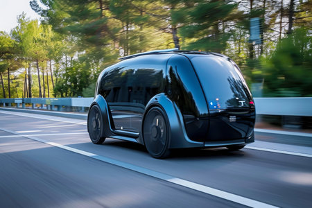 A black car drives down a street surrounded by a lush forest, Autonomous electric vehicles moving without drivers, AI Generated