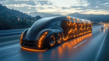 A captivating depiction of futuristic transportation featuring sleek vehicles illuminated by vibrant neon lights on a modern highway.