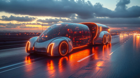 A sleek and modern self-driving car navigates a technological road illuminated by glowing lines, reflecting dusk skies.