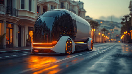 Futuristic Autonomous Vehicle on Modern Urban Street During Twilight