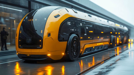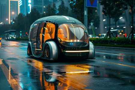 Futuristic Autonomous Electric Vehicle on Urban Street During Rainy Evening