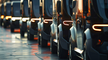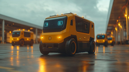 Automated Delivery Vehicles Operating in a Modern Logistics Warehouse During Twilight Hours Generative AI
