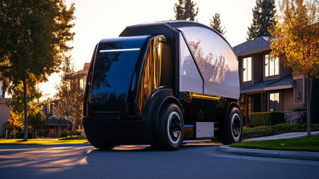 Innovative electric transport vehicle navigating suburban streets during sunset