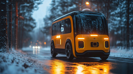 Autonomous Delivery Vehicle Navigating Snowy Streets at Dusk, Showcasing Advances in Logistics and Transportation Technology Generative AI