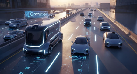 A futuristic autonomous electric delivery van from Quantum Logistics travels on a smart highway alongside other self-driving cars. The road has glowing digital overlays indicating data and routes, illustrating the future of logistics, transportation, and smart city infrastructure.