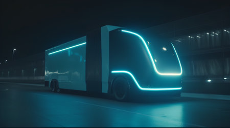 Futuristic autonomous smart truck with neon lights on a rainy night in the city.