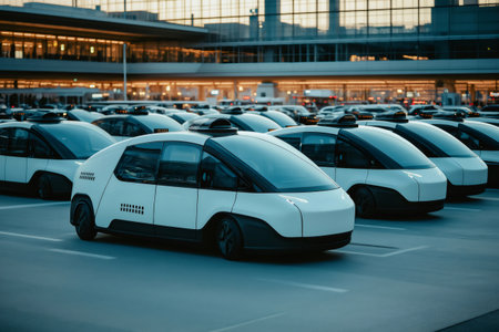 Modern white electric robo taxis parked near airport terminal waiting for passengers, showcasing future of transportation