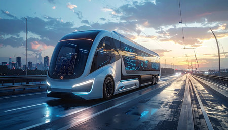 Self-Driving Electric Bus with Digital Network Connectivity in a Smart Cityscape at Night